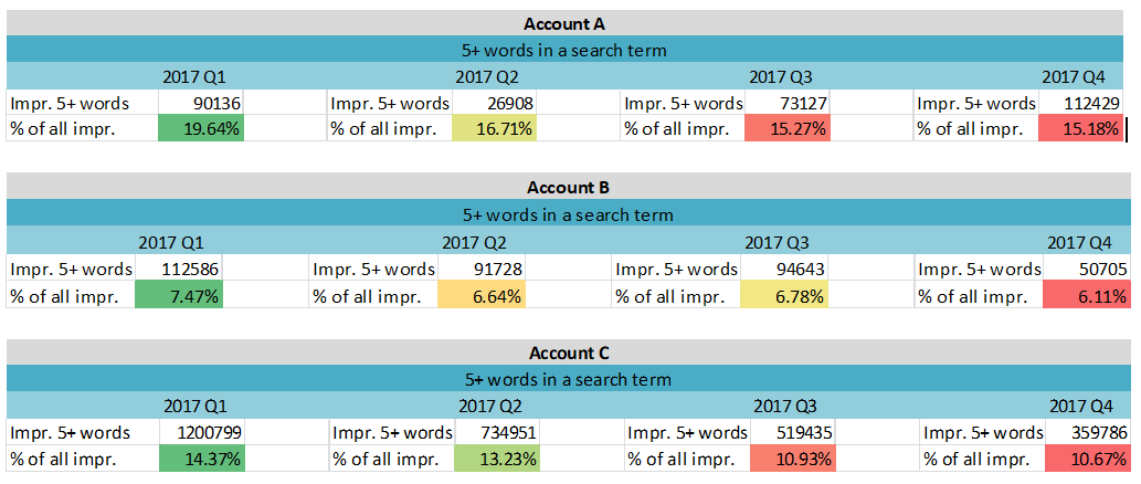 As you can see, the overall trend is that 5+ word searches actually decreased quarter on quarter in 2017. Across the board Q1 displayed the highest percentage of 5+ searches and Q4 the lowest, which is contrary to our expectations as we anticipated that the rise in the number of people owning Voice Search enabled devices, would correlate with longer search queries.