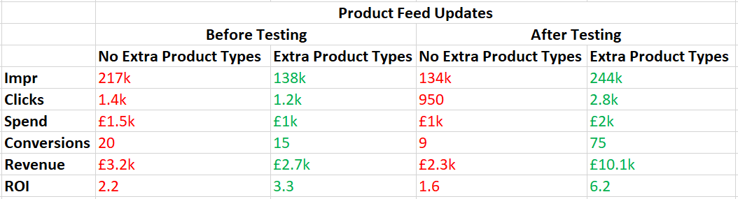 The test looked at how adding product types into the product type section of our client’s Shoptimised feed (which feeds into the Merchant Centre) could improve performance of specific individual products. The product types were used as keywords to give the algorithm signals as to what the products were and how they were defined.